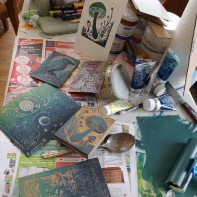 Sara Jane Manning is an artist working in acrylics, lino print, and mixed media artist, working out of her rural home studio near Burrits Rapids, Merrickville and Oxford Mills, Ontario.